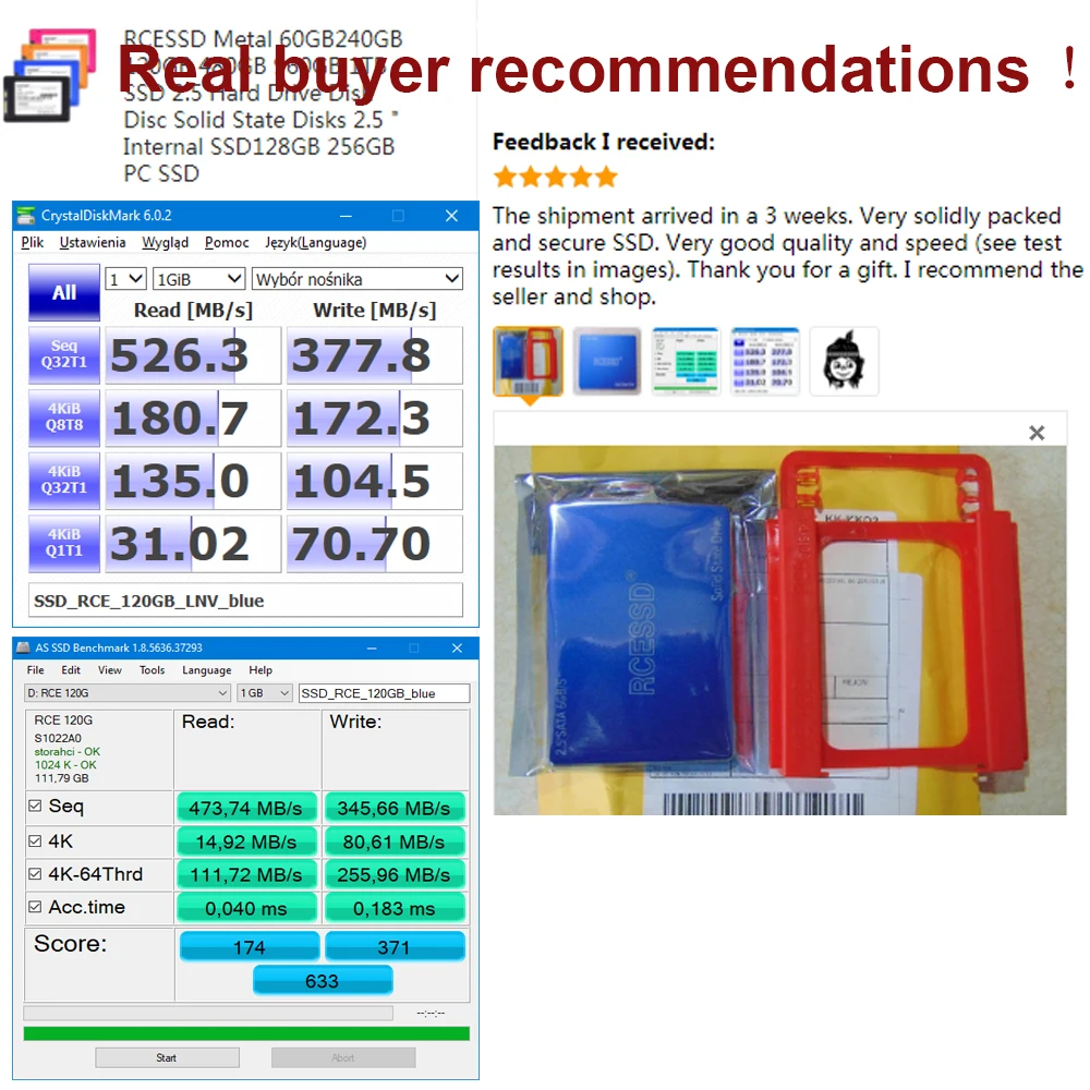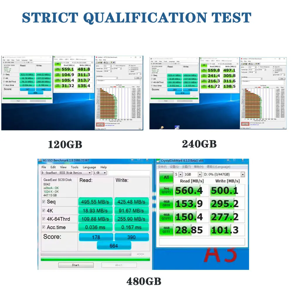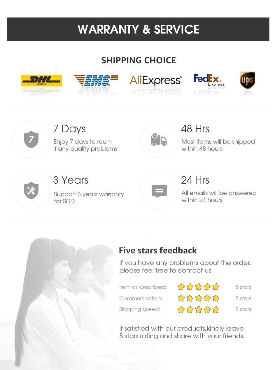 Specification: 1) Interface and application: international standard SATA, backward compatible with SATA 3.0 SATA 2.0 2) Supported systems: Windows XP / 7/8.1/window 2003/2008, DOS, window 10/ Linux, Unix 3) Application: suitable for desktop computers, laptop computers, small computers, all-in-one computers and other business PC 4) High quality: Many years of SSD production experience, after rigorous one-to-one testing Best Service: Factory Direct Service Lowest price: Factory direct sale Quality guarantee: 3 years warranty Notice: The test result just for reference, The test results are related to the test plaform configuration and test siftware version.